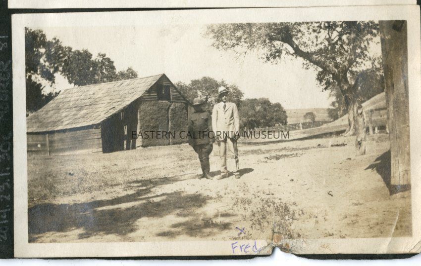 Two men standing in front of a barn. The man on the right is Fred Moorer.