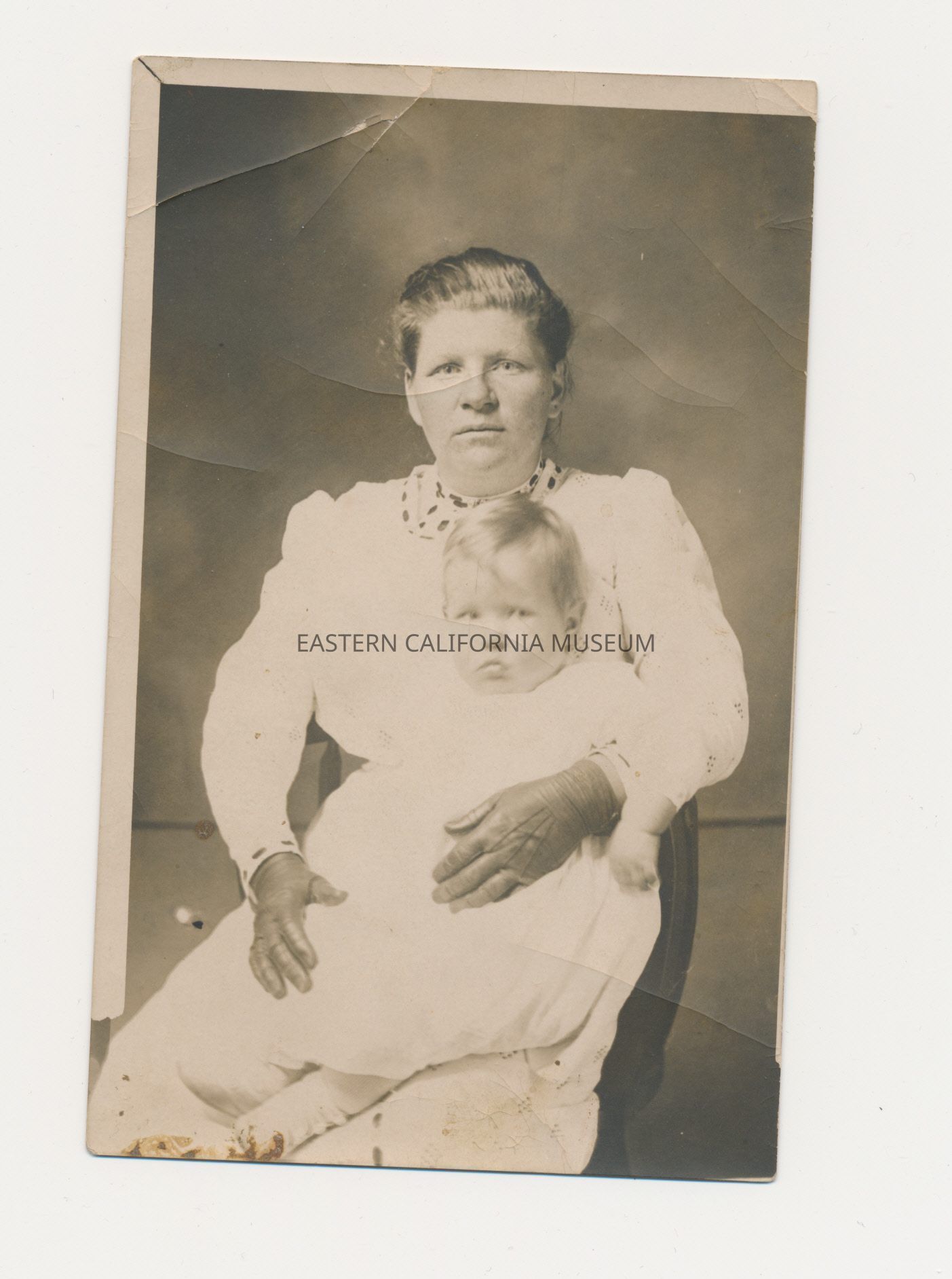 Photo postcard of a woman sitting with a baby in her lap. Both are wearing white dresses.