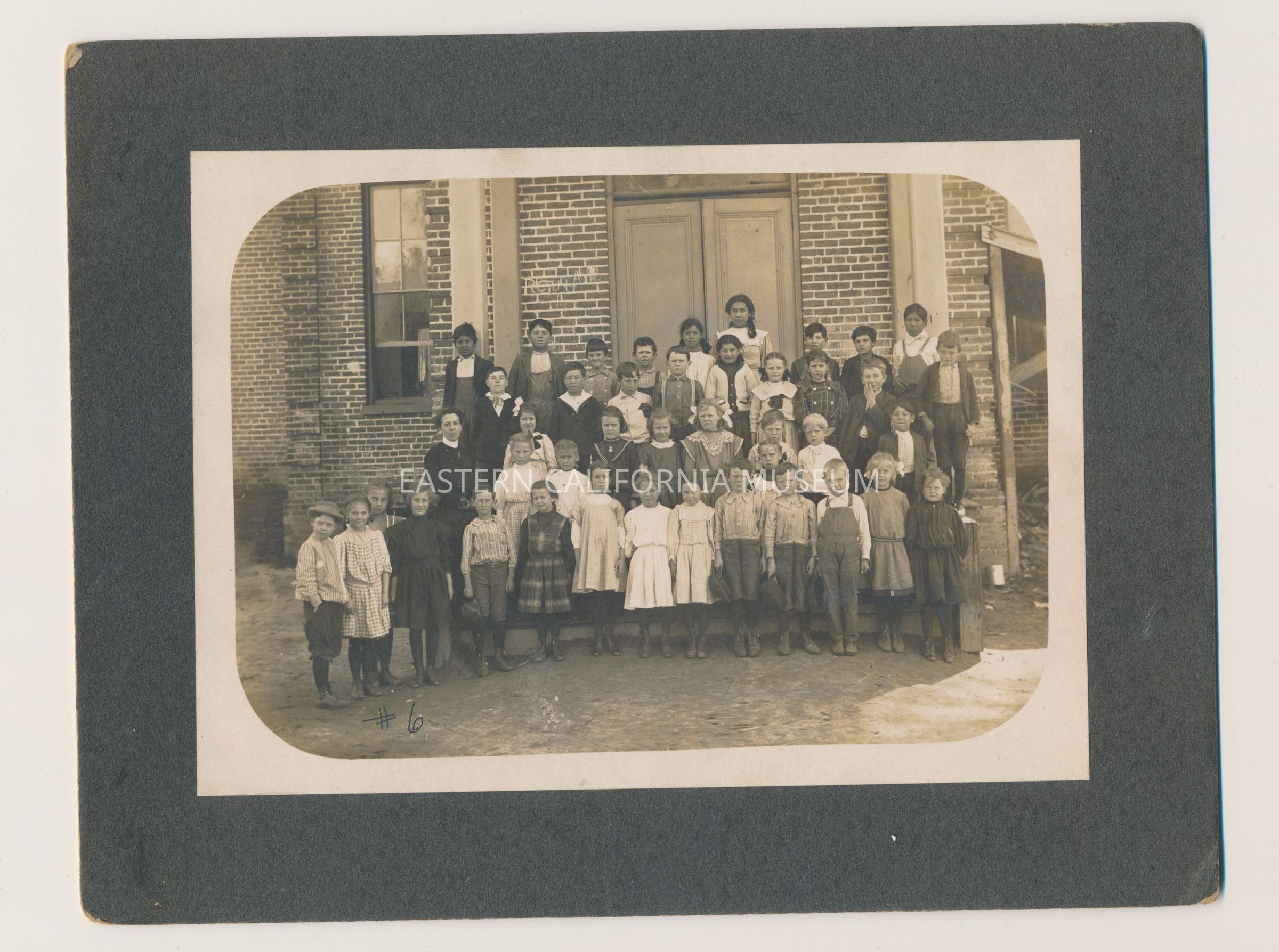 Mounted class photo of a group of school children standing in front of a brick building. Someone has written "#6" in the lower left corner of the image.
