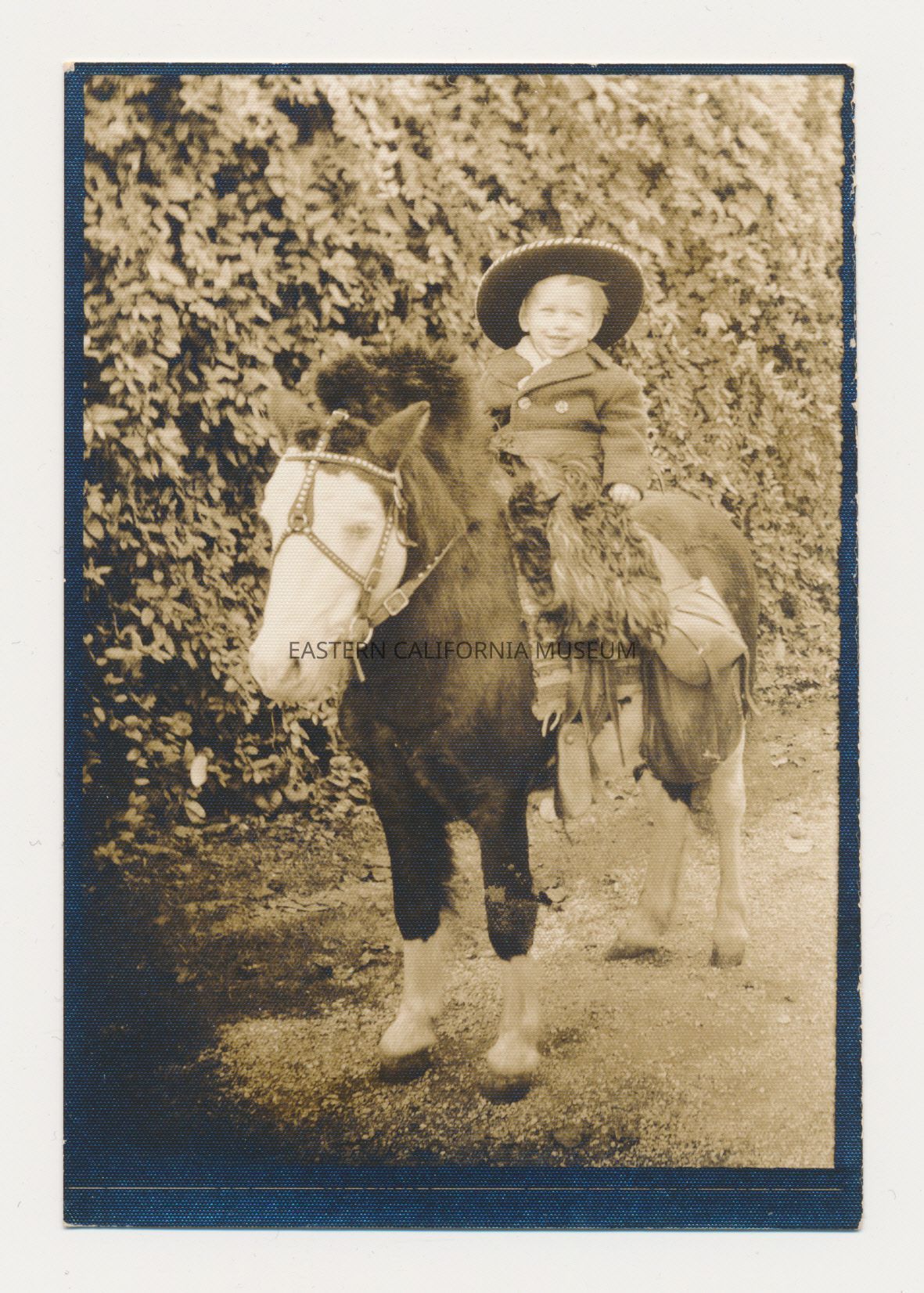 Photo of a little boy dressed as a cowboy on a small pony. He is wearing a sombrero and woolly chaps. There is a striped saddle blanket and a saddlebag visible.