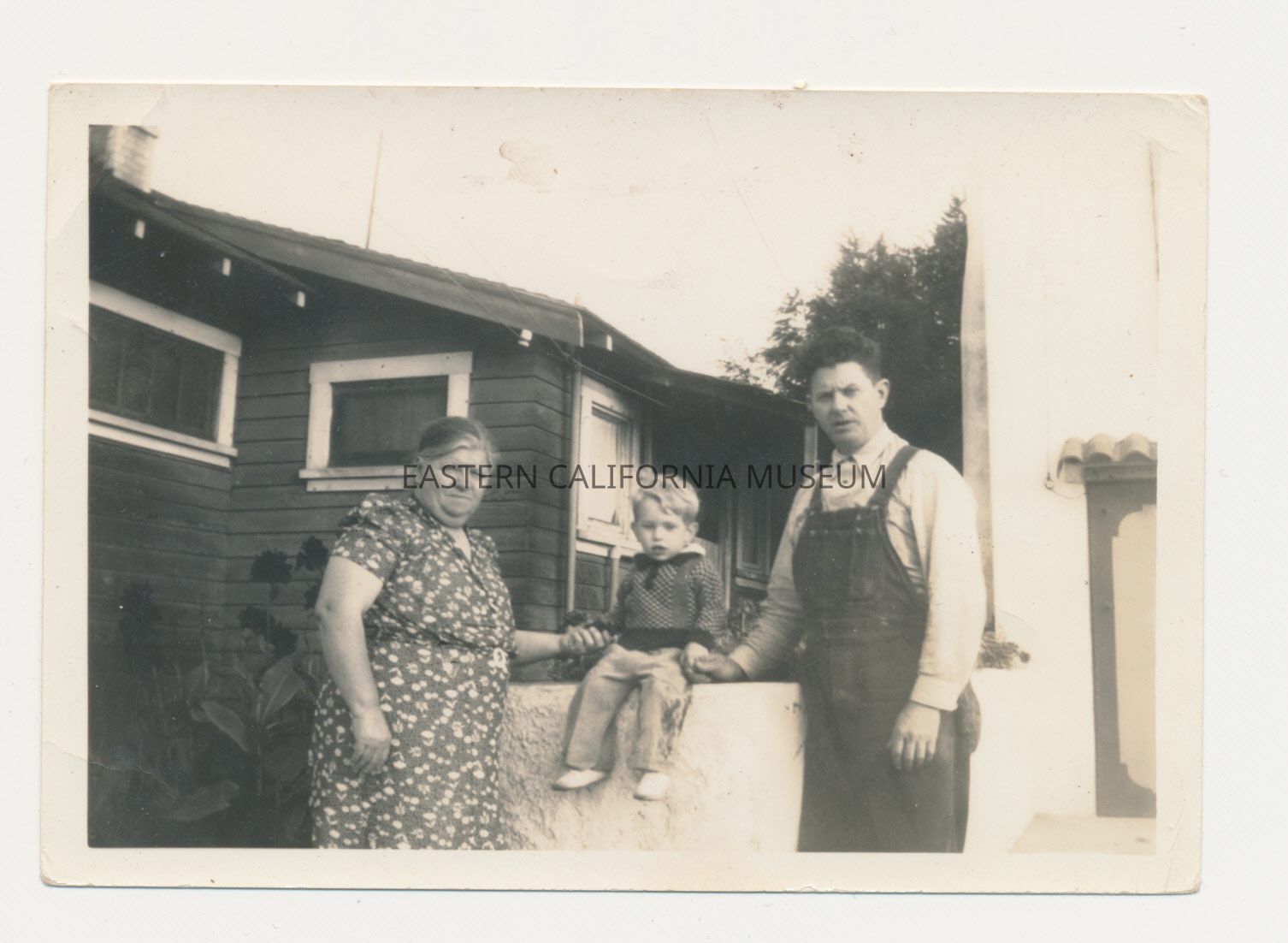 Photo of three people standing in front of a house: an older woman, a little boy, and a middle-aged man.