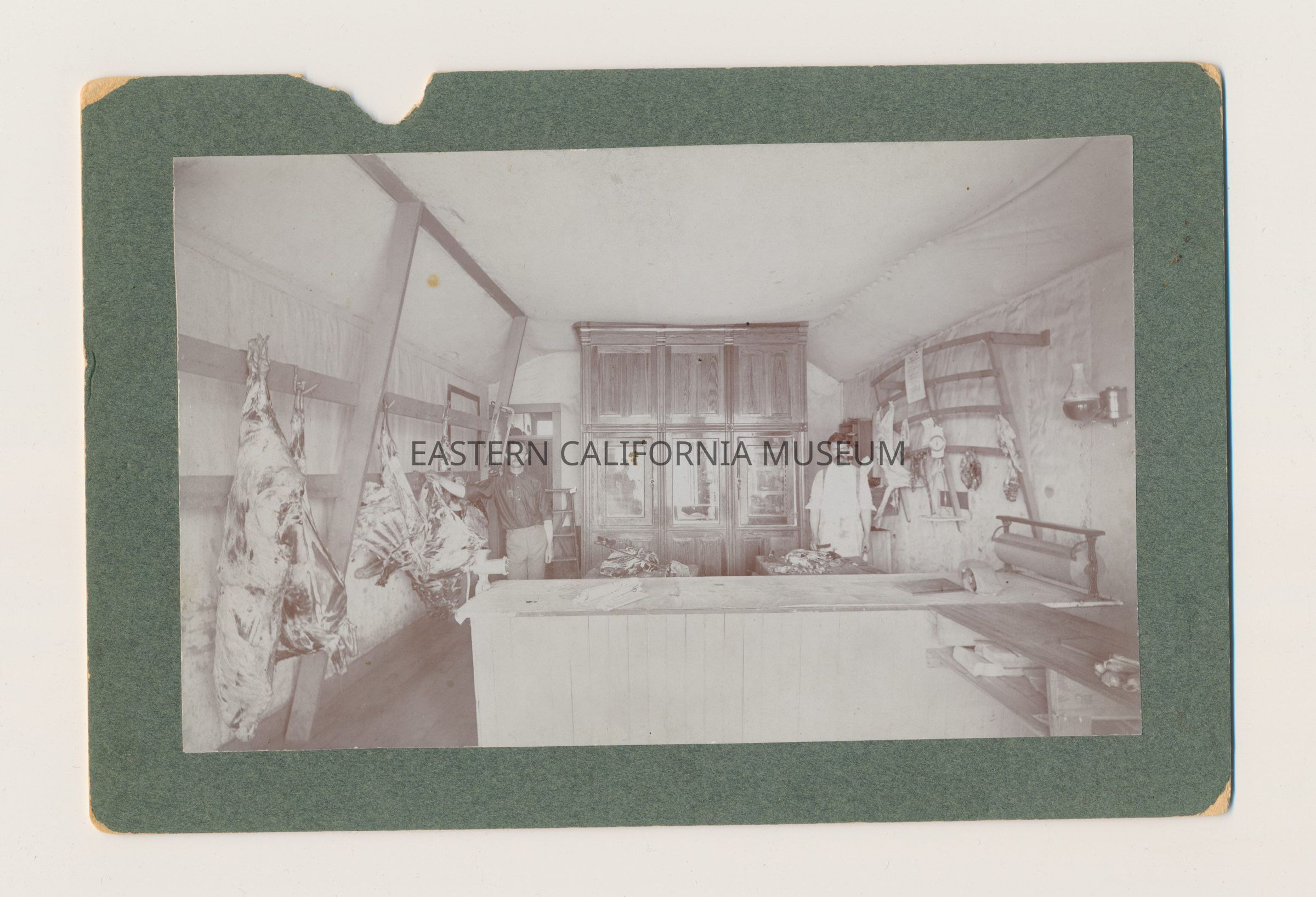 Mounted photo of the interior of a butcher shop. There are two men standing behind the counter and several large pieces of meat hanging from a wooden brace on the left side. The structure appears to be a tent.