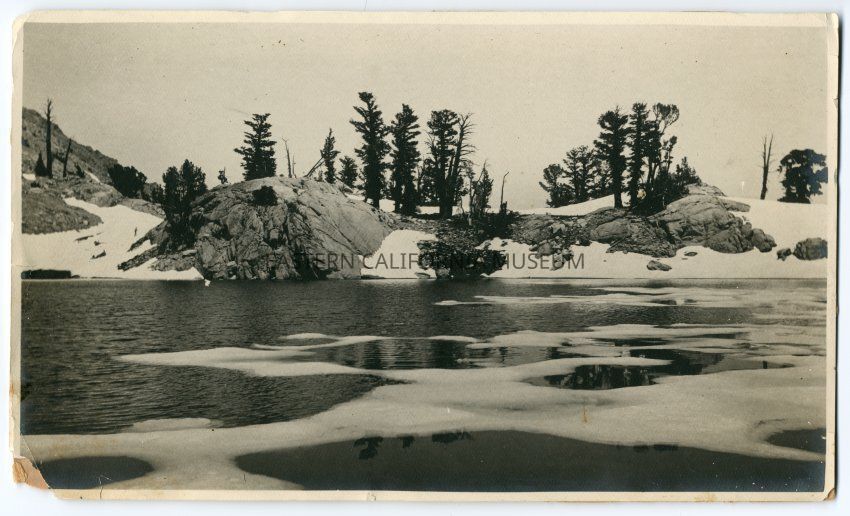 Mounted photograph of a lake with ice and snow all around it. Maybe a person at the far left side of the photo walking in the snow.