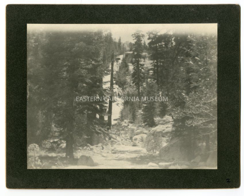 Mounted photo of trees, waterfall, river or creek. On lower right had corner written, "2." Came in envelope labeled, "1904 Mt. Whitney Trail Photos, Gustave F. Marsh records."