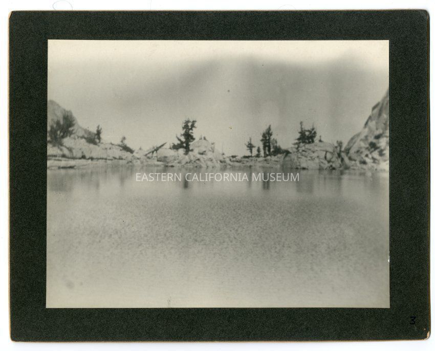 Mounted photo of a lake surrounded by rocks and trees. Came in envelope labeled, "1904 Mt. Whitney Trail Photos, Gustave F. Marsh records." Lower right corner has handwritten, "3."
