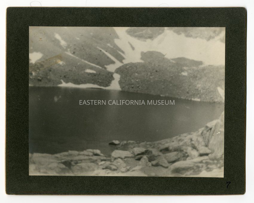 Mounted blurry photo of a lake ringed with rocks, rubble, and snow. Came in envelope labeled, "1904 Mt. Whitney Trail Photos, Gustave F. Marsh records." Lower right corner has, "7" written.
