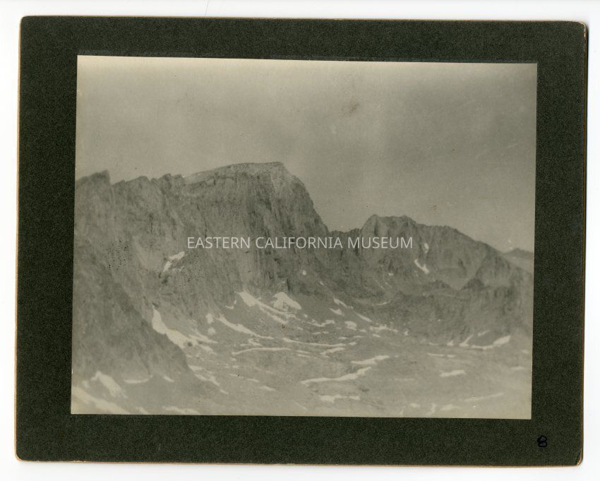 Mounted photo of mountains, peaks, snow, rocky. Came in envelope labeled, "1904 Mt. Whitney Trail Photos, Gustave F. Marsh records." Written in lower right hand corner, "8."