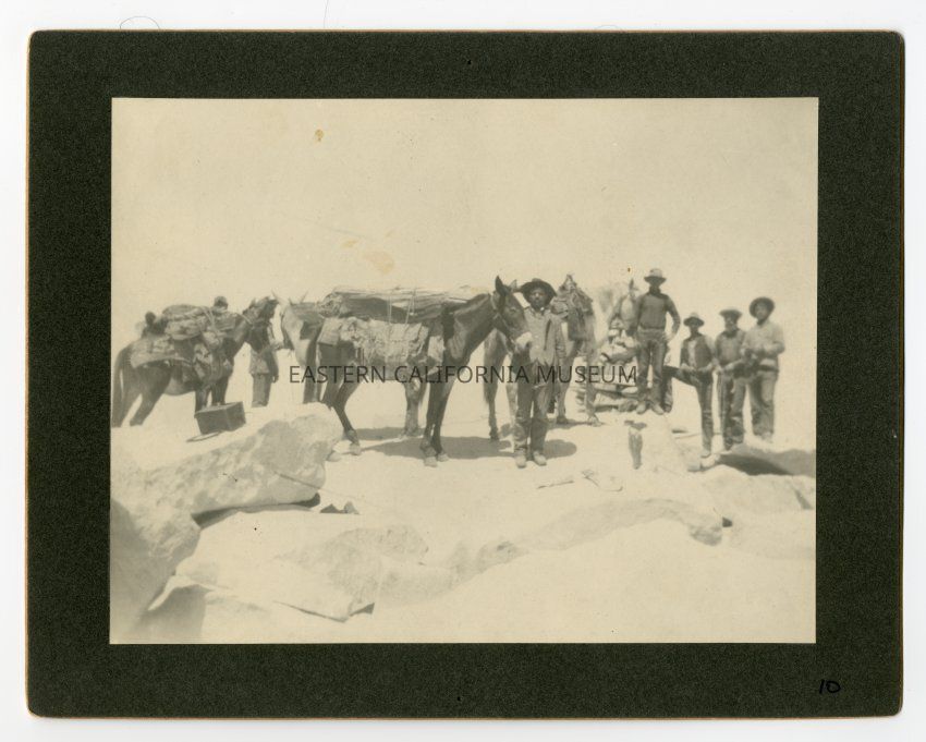 Mounted photo is of men with pack mules on what appears to be the summit of Mt. Whitney. Stone cairn is visible in background. Came in envelope labeled, "1904 Mt. Whitney Trail Photos, Gustave F. Marsh records." In lower right corner is written, "10."Collection