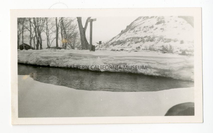 Photo of a body of water, half of which is frozen and the other half is still flowing/rippling. There is a signpost on the bank, but it is facing the wrong direction to read. Structures in distance. Found in an envelope labeled, "Lone Pine water system, intake from Lone Pine Creek" in blue ink and "a very cold and snowy winter" written in pencil.