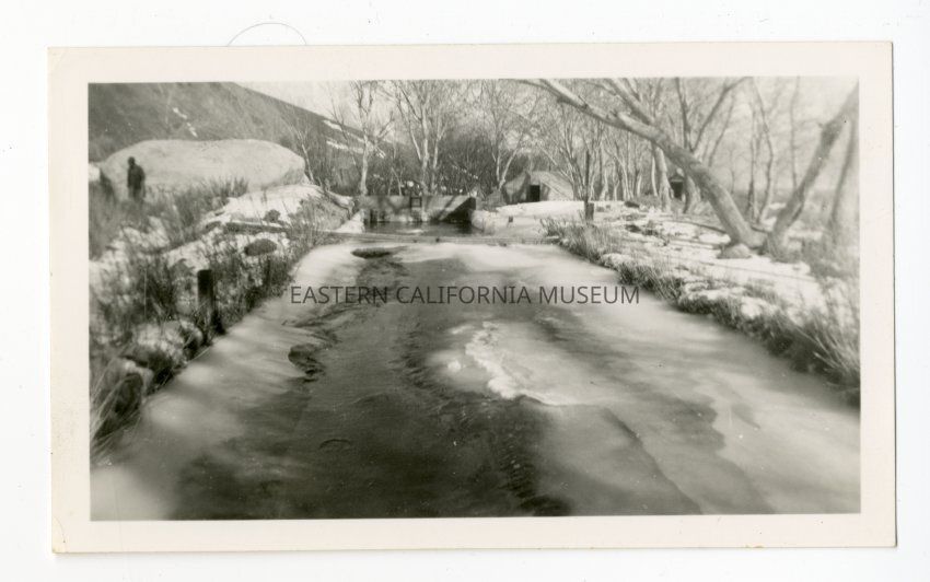 Photo of a river/creek/stream frozen and covered in ice. Surrounded by trees, possibly the intake at Lone Pine Creek. Structure in distance. Found in an envelope labeled, "Lone Pine water system, intake from Lone Pine Creek" in blue ink and "a very cold and snowy winter" written in pencil.