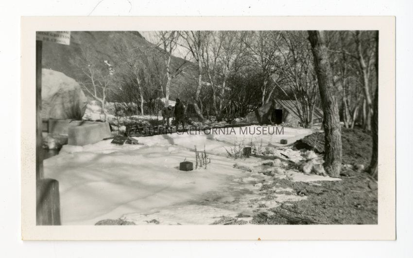 Photo of a frozen river/creek/stream, two men standing on far bank, building or structure in background. A sign partially visible in top left hand corner that contains the words, "these grounds" and "Dr. Crook." Found in an envelope labeled, "Lone Pine water system, intake from Lone Pine Creek" in blue ink and "a very cold and snowy winter" written in pencil.