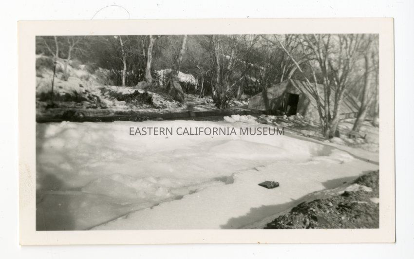 Photo of a rectangular pool of frozen water--possibly the Lone Pine Creek intake. Structure or building is visible, also trees and snow. Found in an envelope labeled, "Lone Pine water system, intake from Lone Pine Creek" in blue ink and "a very cold and snowy winter" written in pencil.