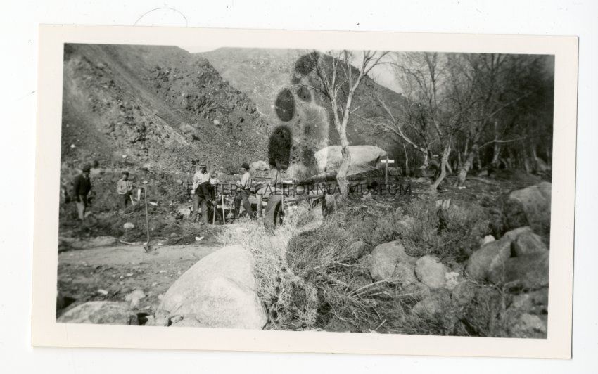 Photo of six men using shovels to dig near what may be the Lone Pine Creek intake. A sign is visible in the distance, trees, rocks, brush. Some exposure damage to the middle of the photo. Found in an envelope labeled, "Lone Pine water system, intake from Lone Pine Creek" in blue ink and "a very cold and snowy winter" written in pencil.Collection