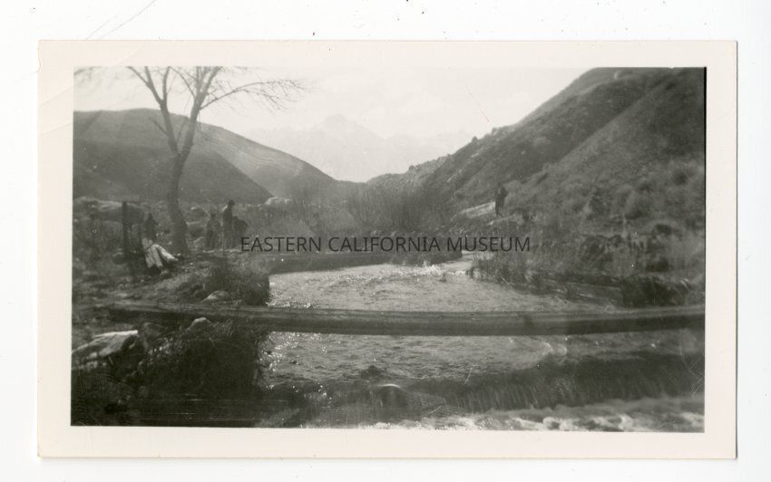 Photo is of a bridge over a creek/river/stream with a tree on the left bank. Six men are present on both sides of the river. Mountains seen in the distance. Found in an envelope labeled, "Lone Pine water system, intake from Lone Pine Creek" in blue ink and "a very cold and snowy winter" written in pencil.Collection