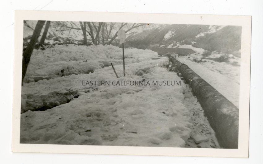 Photo is of a pipe running through snow. Trees and mountains visible. Possibly at or near the Lone Pine Creek intake. Found in an envelope labeled, "Lone Pine water system, intake from Lone Pine Creek" in blue ink and "a very cold and snowy winter" written in pencil.Collection