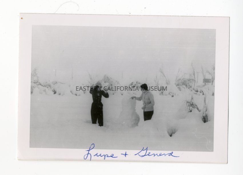 Photo of two women playing in the snow and making a snowman. Labeled in blue ink as Lupe (left) and Genera or Geneva (right).