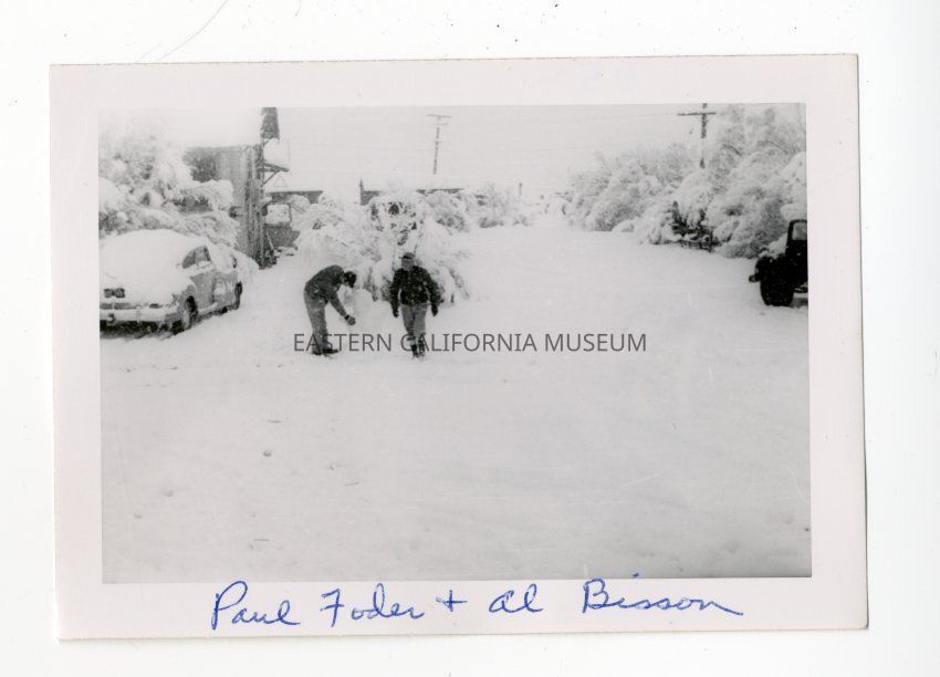Photo of two men in a snowy street. Man on left is making a snowman. Labels written in blue ink identify man on left as "Paul Foder" and man on right as "Al Bisson." Vehicles, buildings, and power lines also visible in photo.Collection