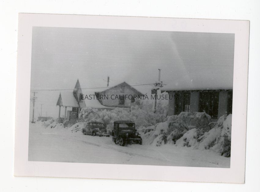 Photo of a street with two houses covered in snow and two vehicles parked out front.