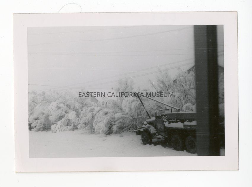 Photo of a truck parked in front of a house. Power lines overhead. There is a post in the right hand side of the photo. Snow covering everything.Collection