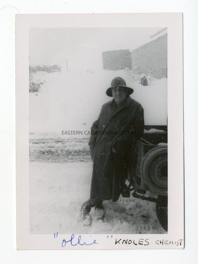 Photo of a man leaning against the rear end of a truck in a snow storm. He is labeled, "Ollie Knoles, Chemist."