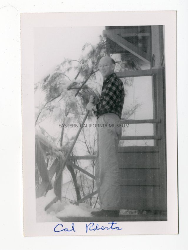 Photo of a man labeled, "Cal Roberts," shoveling snow off of his porch.