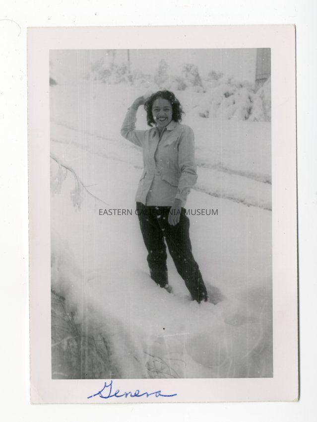 Photo of a woman getting ready to throw a snowball at the photographer. She is labeled, "Genera" or "Geneva."