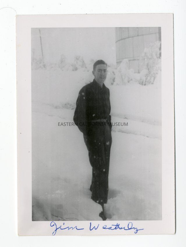Photo of a man standing out in the snow in front of what appears to be a water tank. He is labeled, "Jim Weatherly."