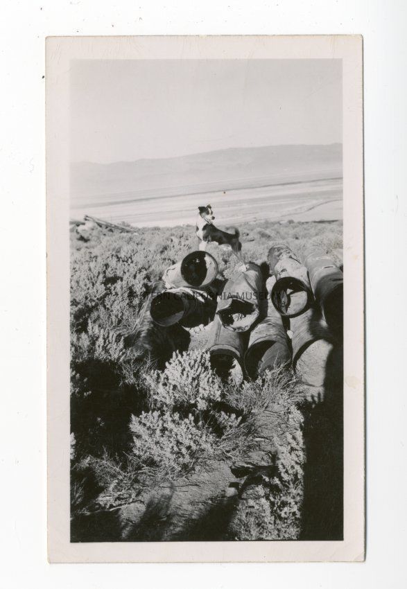 Photo of a dog standing on a pile of pipes. Looks like the Owens Lake and Inyo Mountains are in background. Probably taken on the grounds or nearby the Pacific Alkali Company plant (PPG).Collection