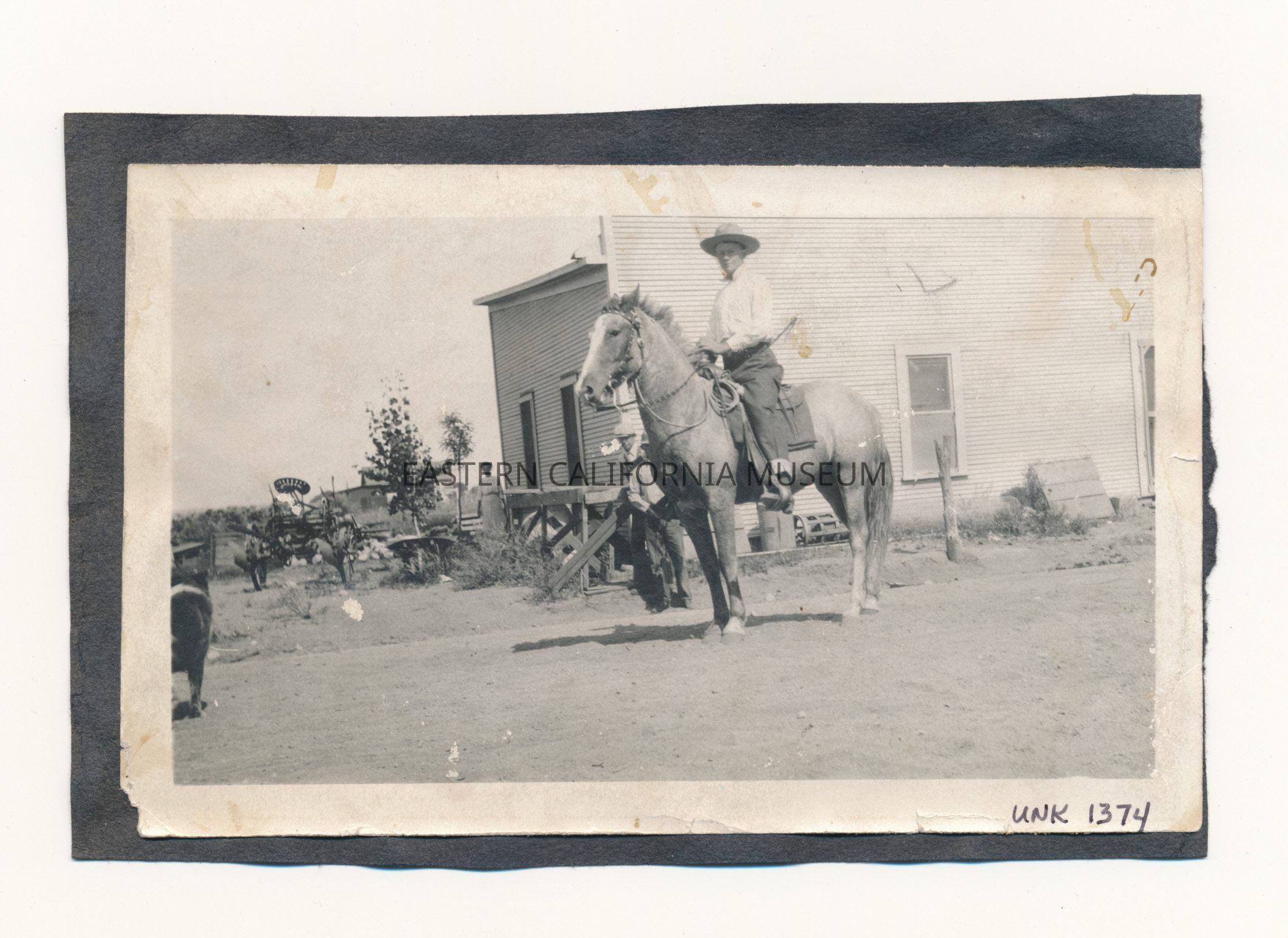 Photo of a young man on horseback. There is a big building in the background, two men partially hidden behind the horse, and a woman by the back of the building. There is farm equipment on the left side of the photo. The building has been identified as the packing house at Manzanar.Photograph Details