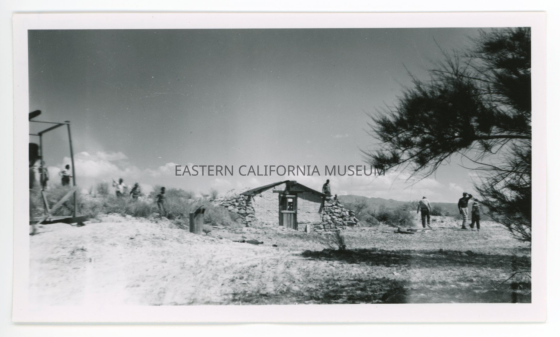 Photo taken during a museum trip to Sand Springs via the new Big Pine and Saline Valley Road on 09/16/1961. It shows many people exploring around an old stone or adobe brick building. Unsure if this is related to the sulphur mine.