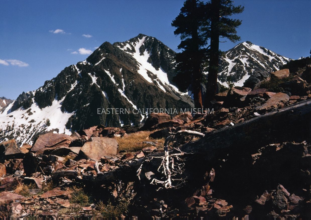 Color photo of mountain peaks, two trees, and reddish boulders in the foreground. Maybe Independence Peak? Taken by Bob Alan Rowe.