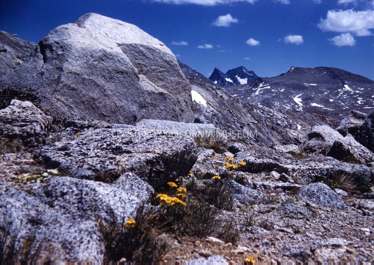 Color photo of boulders and yellow wildflowers in the Sierra Nevada taken by Bob Alan Rowe.
