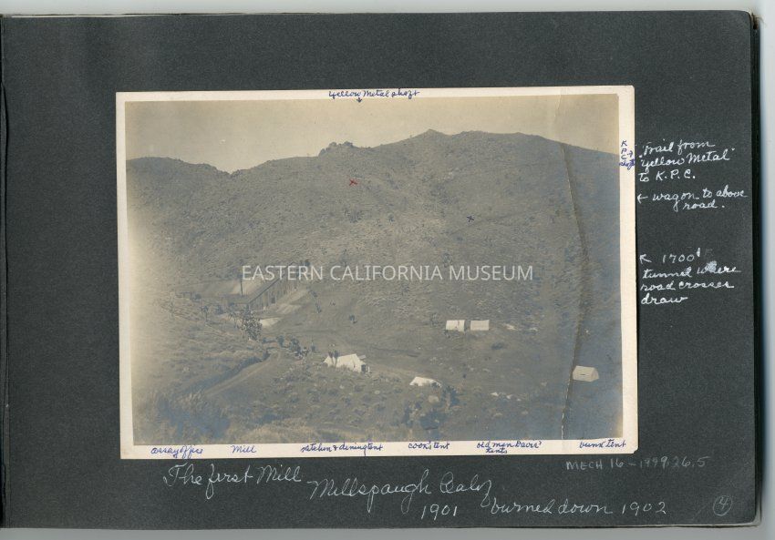 Caption on album page: The first mill, Millspaugh, Calif., 1901, burned down 1902. Trail from "Yellow Metal" to K.P.C. Wagon to above road. 1,700' tunnel where road crosses draw.