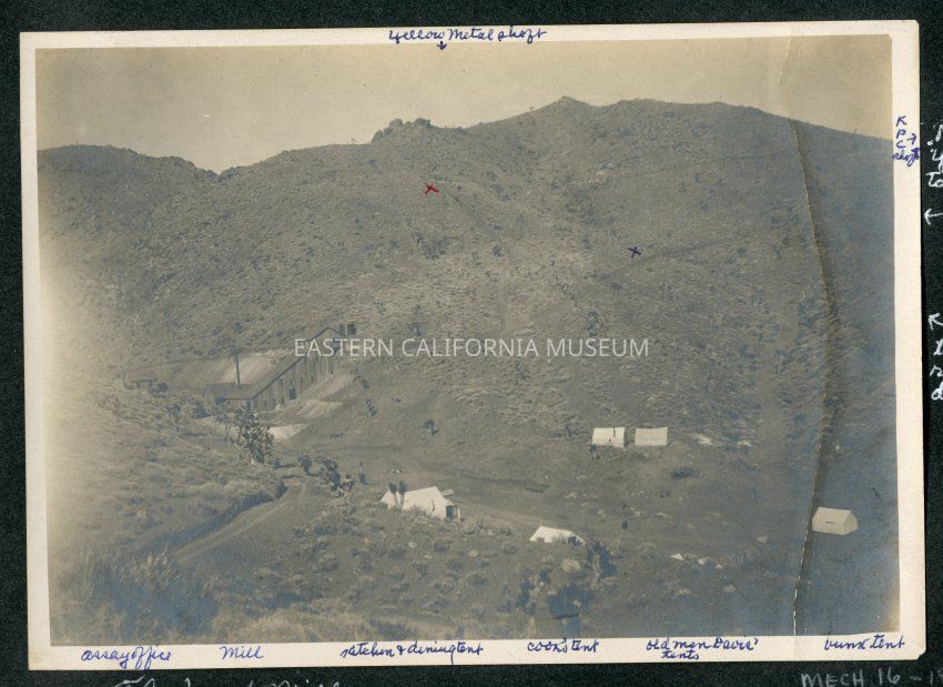 Photo of the mining camp of Millspaugh. The large mill building is to the left and several white canvas tents are scattered along the area. Various structures and places have been identifed in ink along the edges of the photo: on top in center is "Yellow Metal shaft," on right side is "KPC shaft," along bottom from left to right is "assay office, mill, kitchen and dining tent, cook's tent, Old Man Davis' tents, bunk tent."