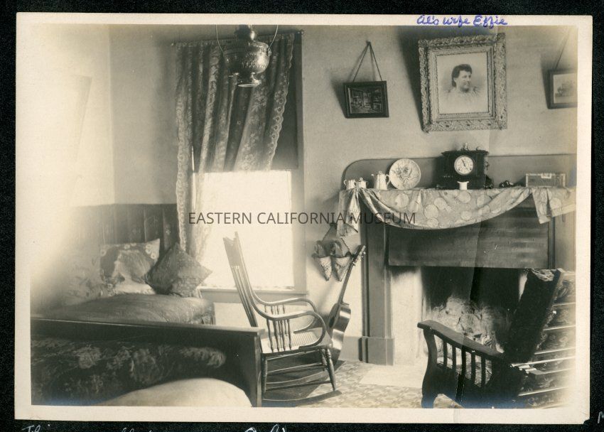 Interior photo of a home at Millspaugh. Written in ink along the top edge of the photo above a photo hanging on the wall: Al's wife Effie.