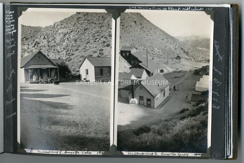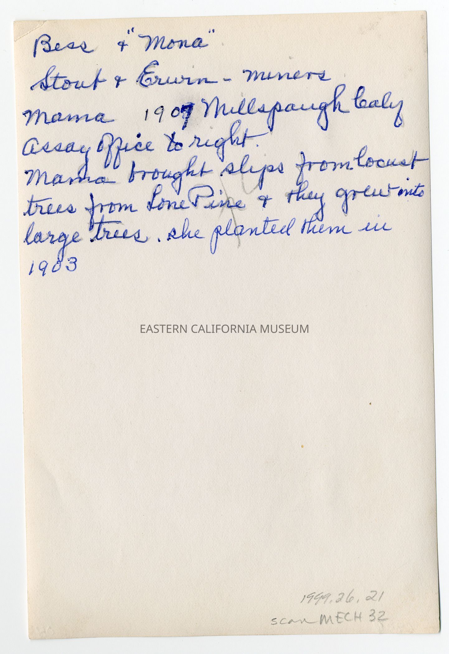 Written in blue ink on reverse: Bess and "Mona." Stout and Erwin miners. Mama, 1907, Millspaugh Calif. Assay office to right. Mama brough slips from locust trees from Lone Pine and they grew into large trees. She planted them in 1903.Collection