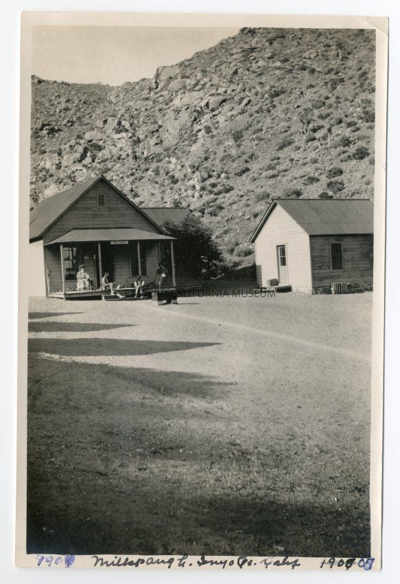 Photo of four people and one dog lounging on the front porch of the Millspaugh post office building and one other structure. Written in ink on bottom edge of photo: 1907 Millspaugh, Inyo Co. Calif. 1908 [date crossed out and replaced with 1907].
