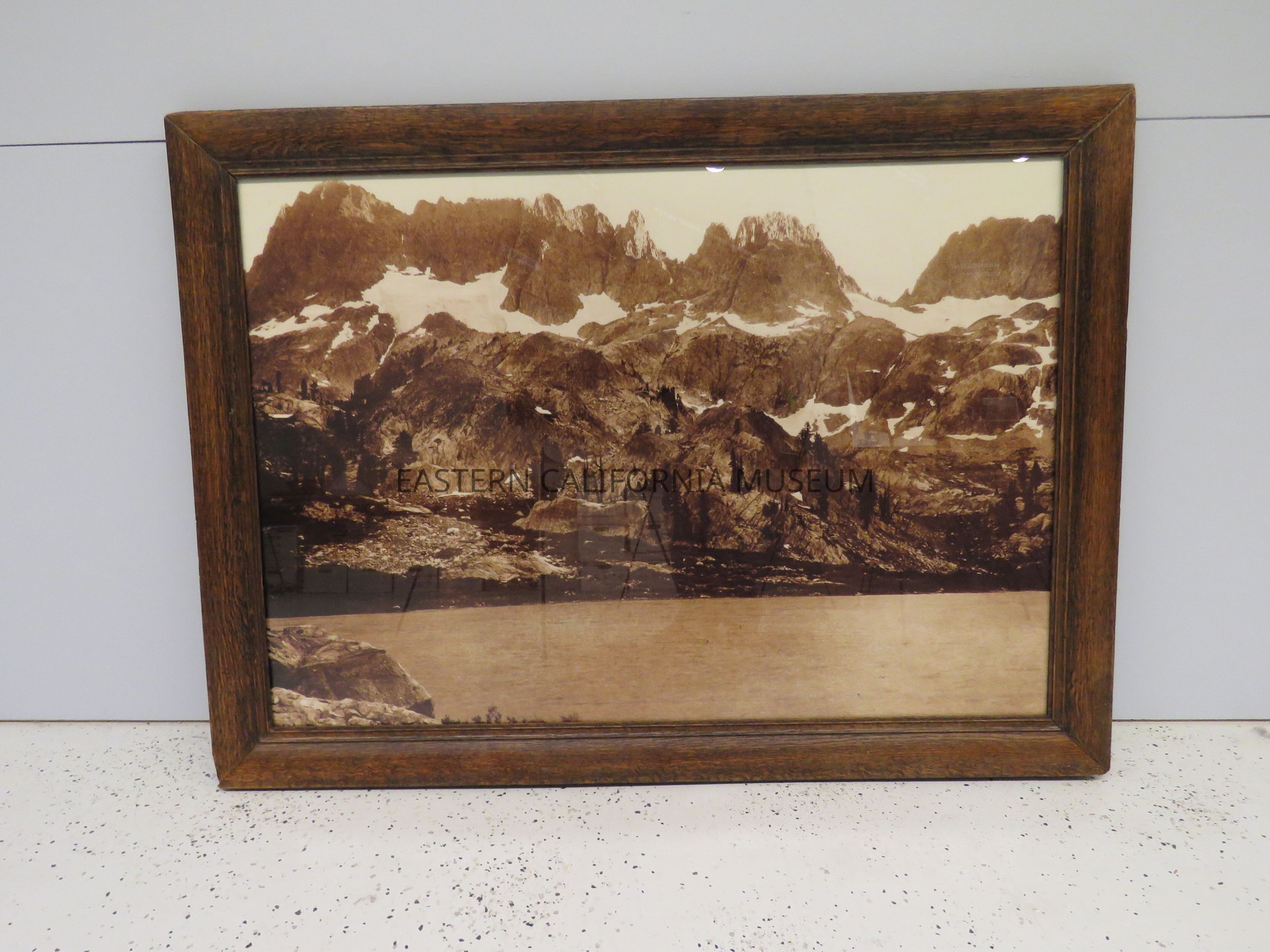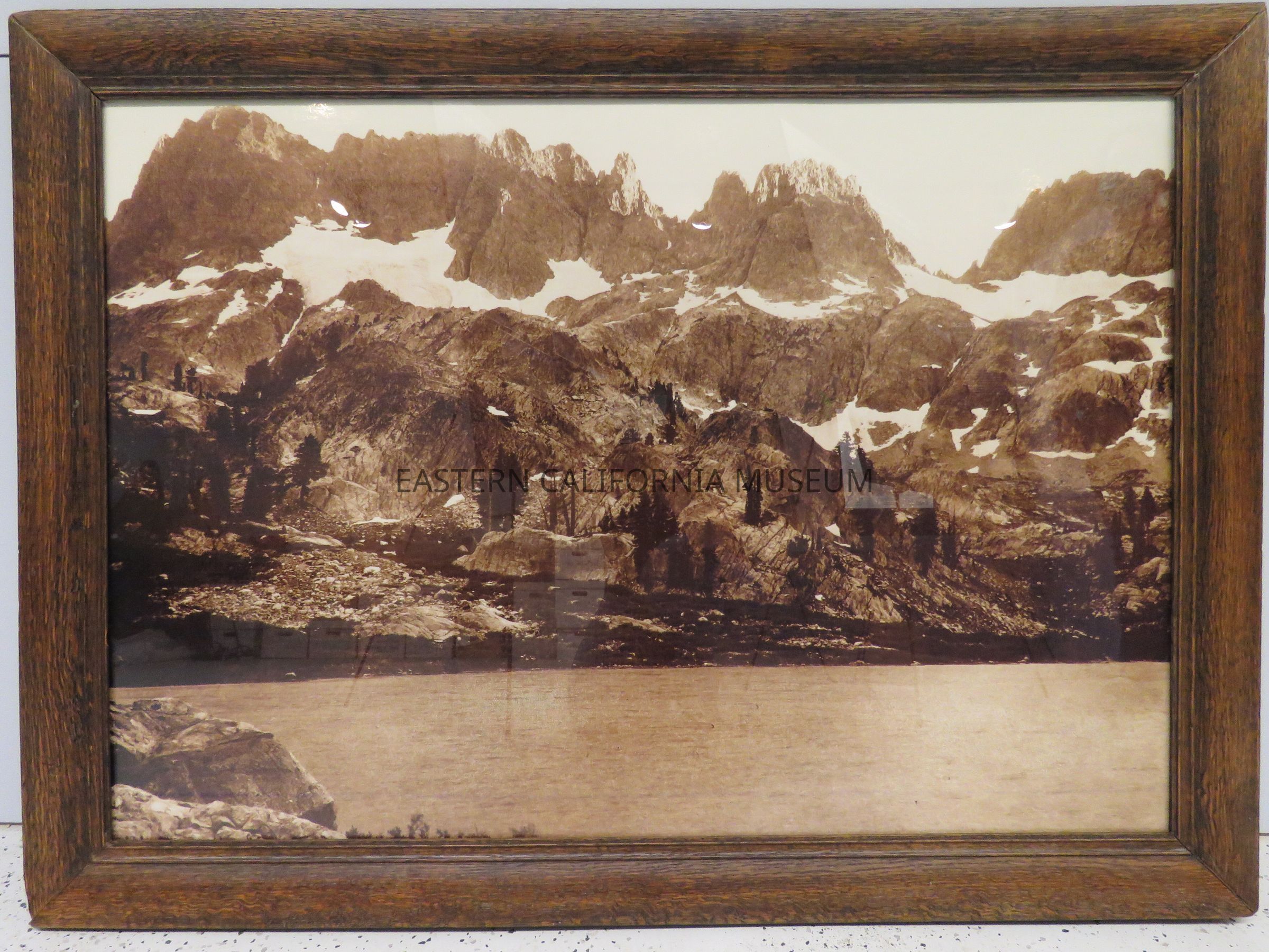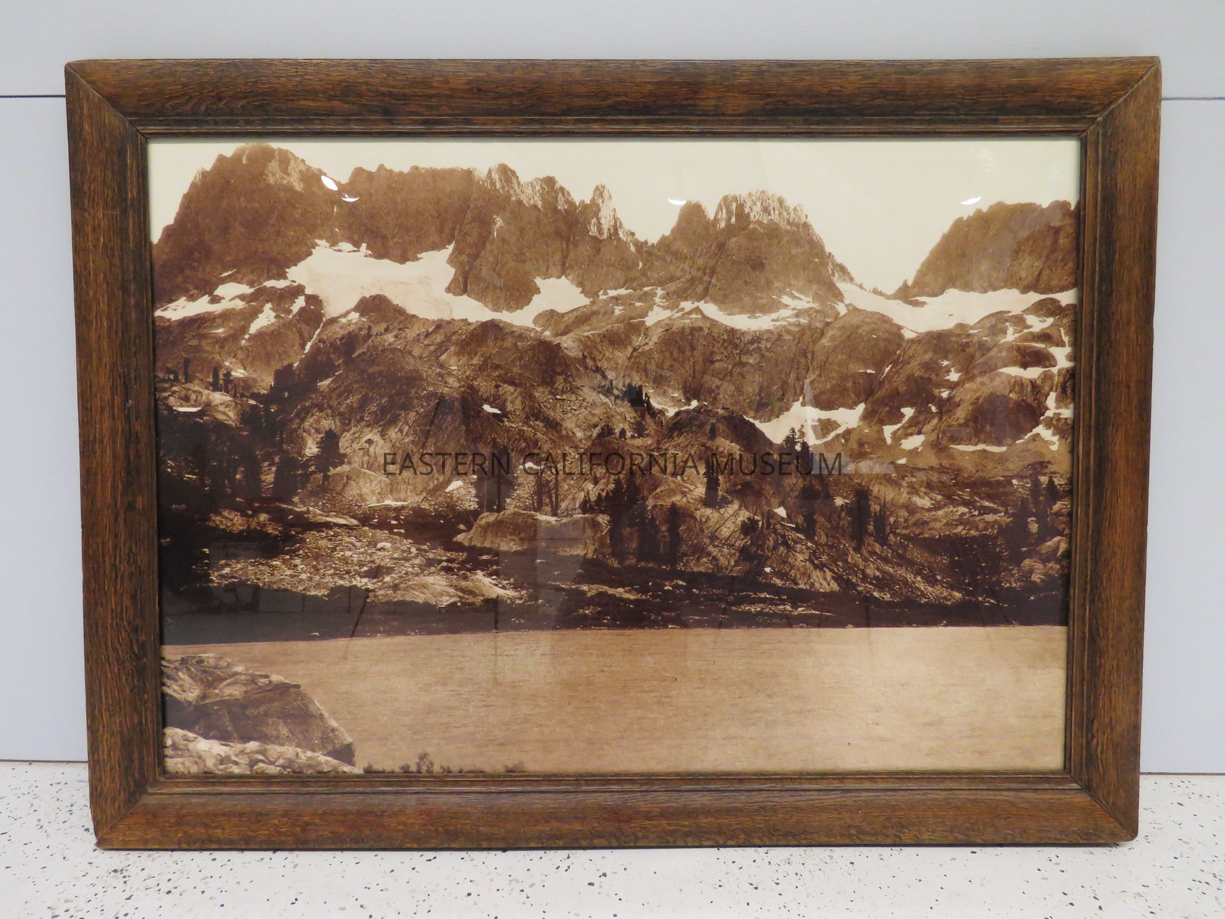 Large (26" x 36") framed photo of Lake Ediza, Clyde Minaret, and crest. It is the last photo taken by Walter A. Starr, Jr. before his death in 1933. Starr's body was found on Michael's Minaret by Norman Clyde. Norman brought the box camera out and it was eventually given to Jules M. Eichorn. Film was developed from 4 x 6 negative.