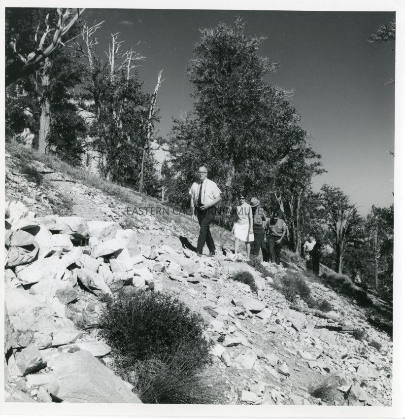 B&W print: several men, one woman, walking uphill in the Bristlecone Pine Forest