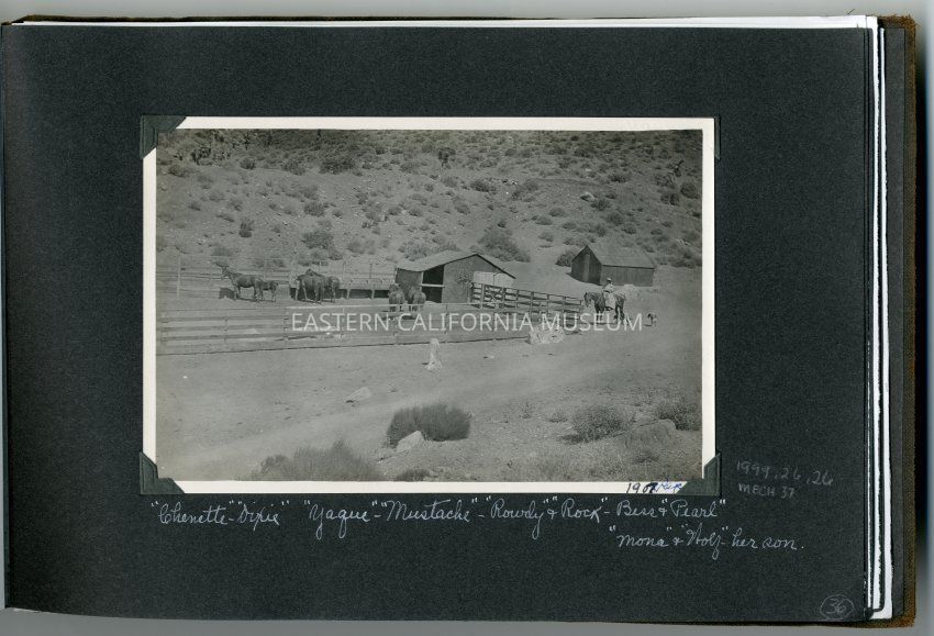 Caption on album page: "Chenette," "Dixie," "Yaqui," "Mustache, "Rowdy," and "Rock," Bess and "Pearl." "Mona" and "Wolf" her son.