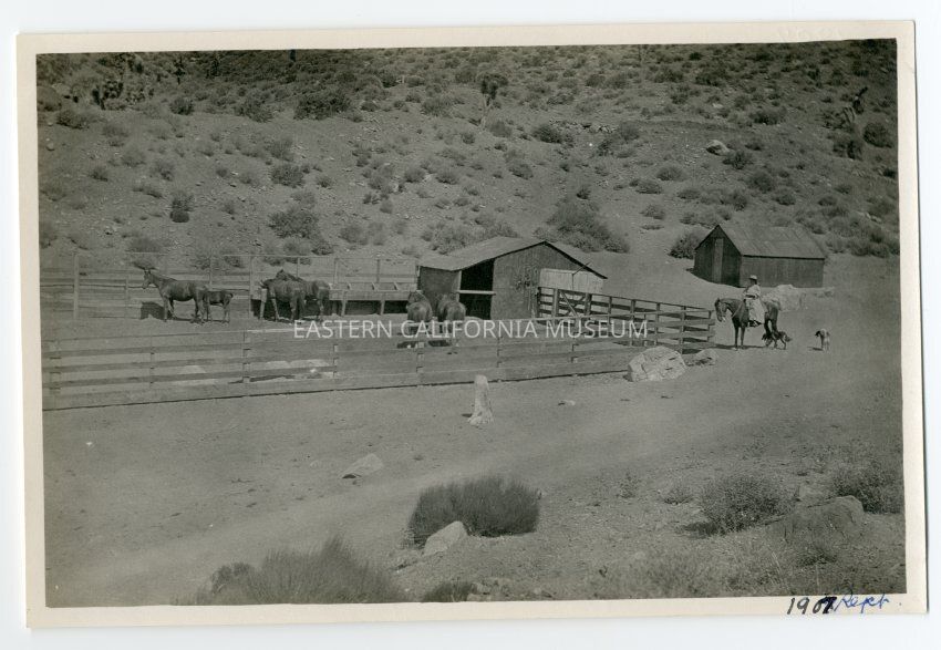 Photo of the corrals at Millspaugh mining camp. Woman on horseback to right of corral with two dogs. Written in ink on bottom edge of photo: 1907 Sept.