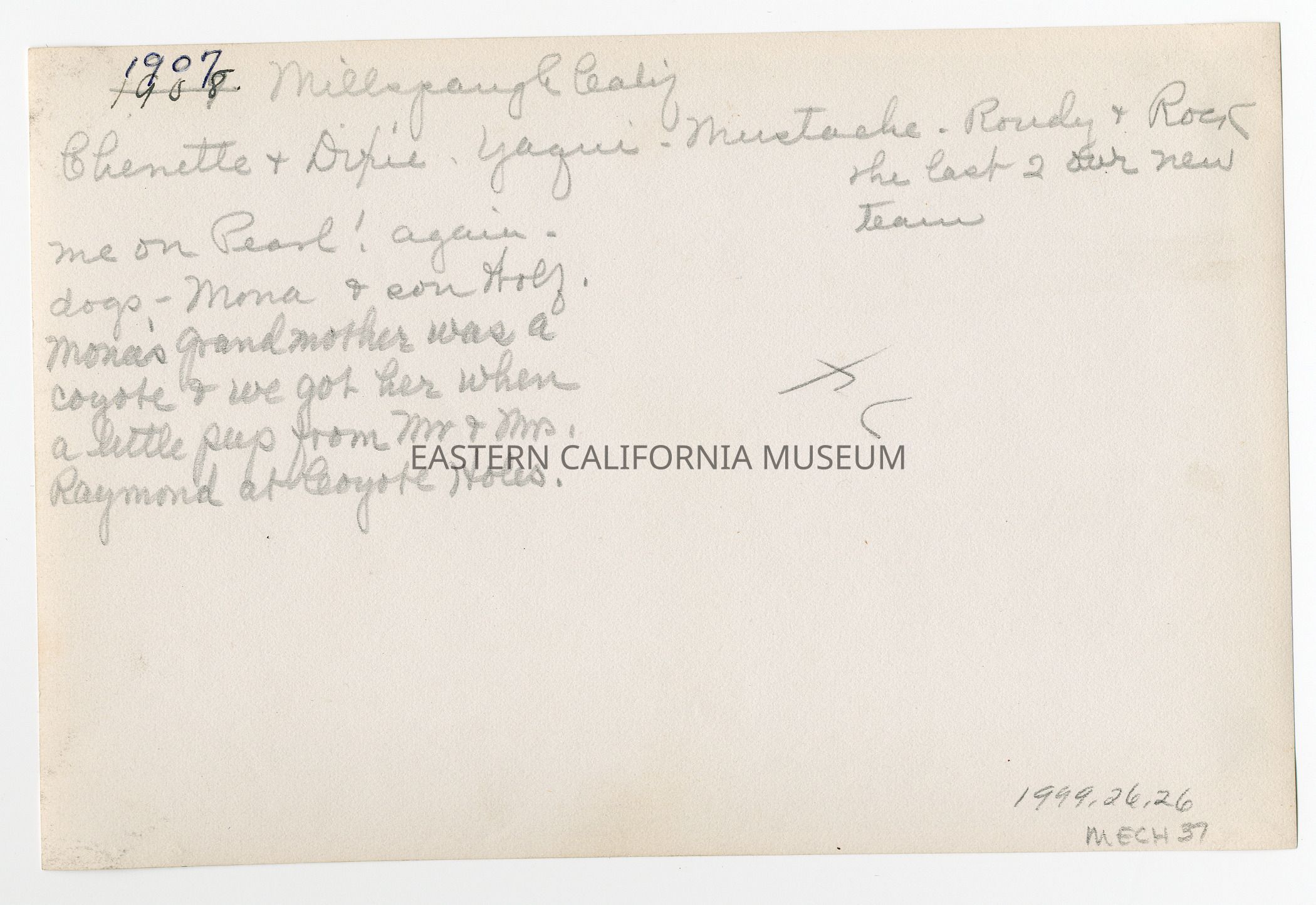 Written in pencil on reverse: 1908 [crossed out and replaced with 1907] Millspaugh Calif. Chenette and Dixie, Yaqui, Mustache, Rowdy, and Rock. The last 2 our new team. Me on Pearl again. Dogs--Mona and son Wolf. Mona's grandmother was a coyote and we got her when a little pup from Mr. and Mrs. Raymond at Coyote Holes.Collection