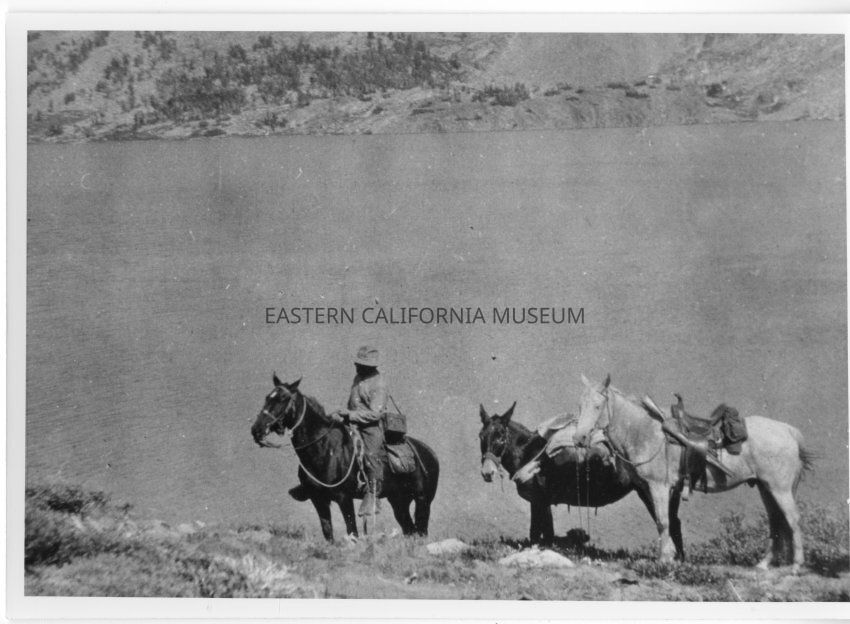 B&W glossy print: 1 man on horseback, 1 saddled horse, 1 mule beside a lake