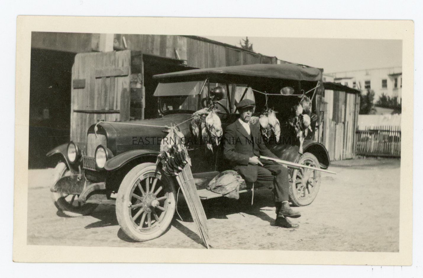 Photo of a hunter with a shotgun or rifle sitting on the running board of an early vehicle surrounded by the man birds (ducks?) he has shot. There are buildings in the background.