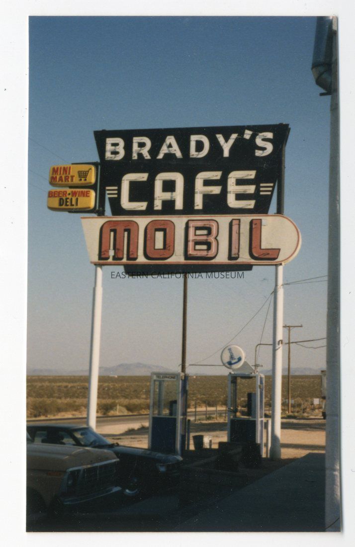 Color photo of the sign for Brady's Cafe. Written in blue ink on reverse: 85-I.