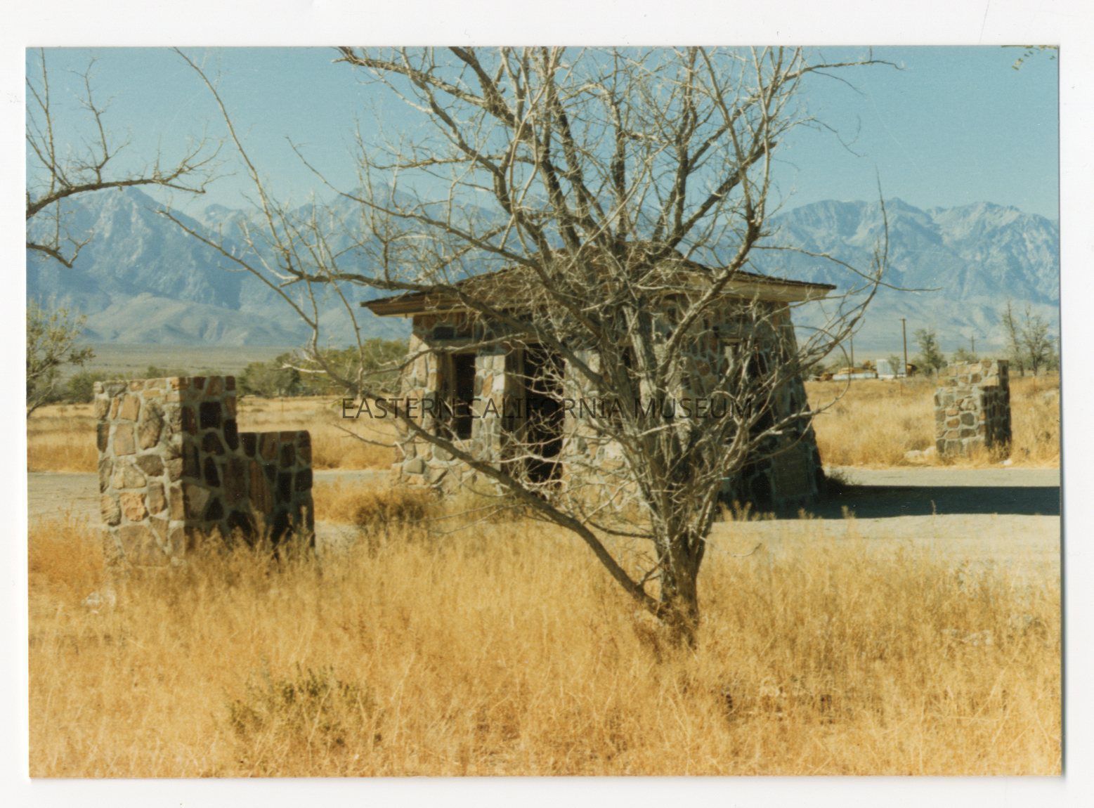 Color photo of the sentry house at the entrance to Manzanar with a tree in the foreground.