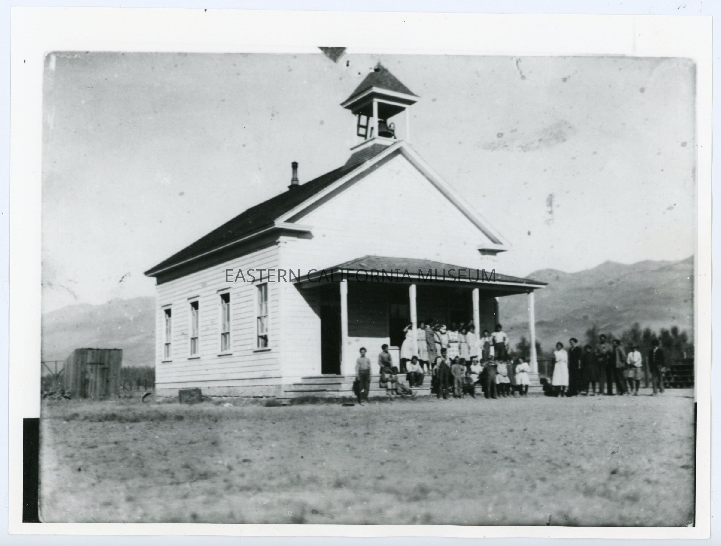 Copy of a photo of a group of students in front of a school house. There is a bell in the cupola. Location is unknown, but likely to be Bishop or around Bishop.