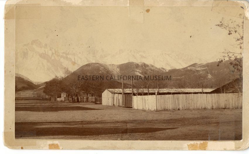 Mounted photo facing West (Sierra Nevada in background). Long building enclosed with fence.