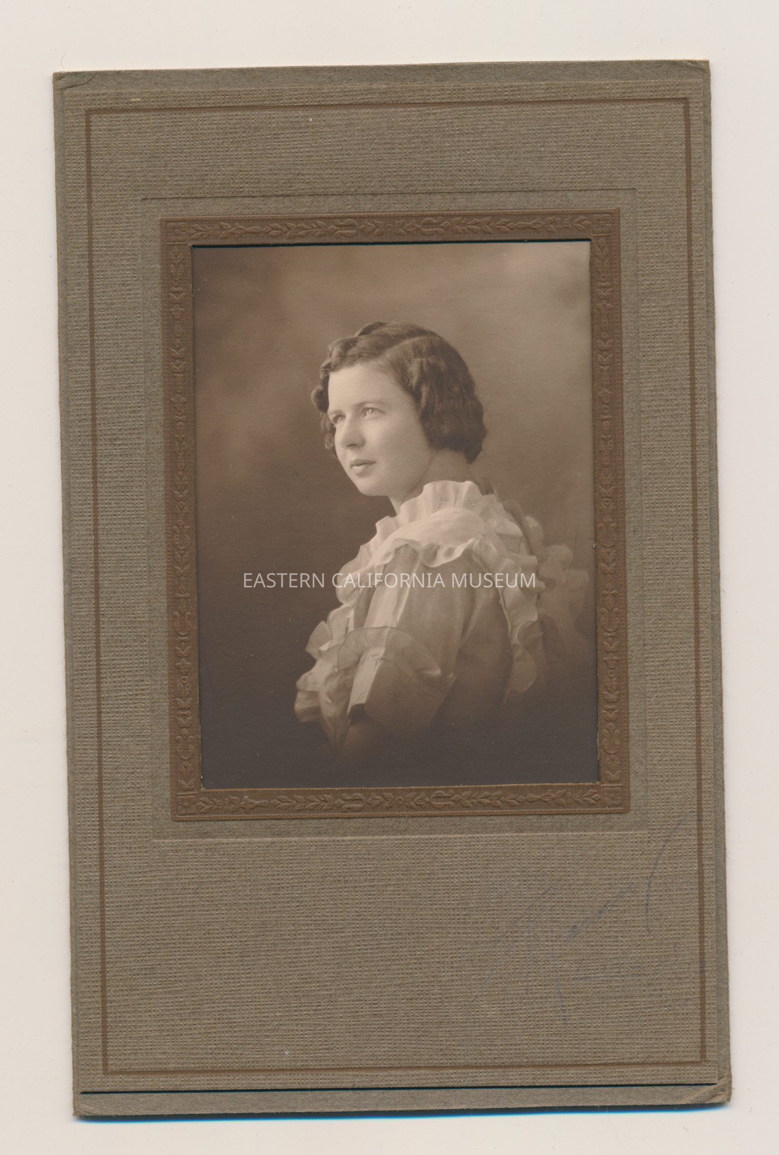 Studio portrait of a young woman. The photographer signed in pencil in the lower right corner of the matting, but it is difficult to make out--possibly Ramsey? The print is protected by a book-style cover.