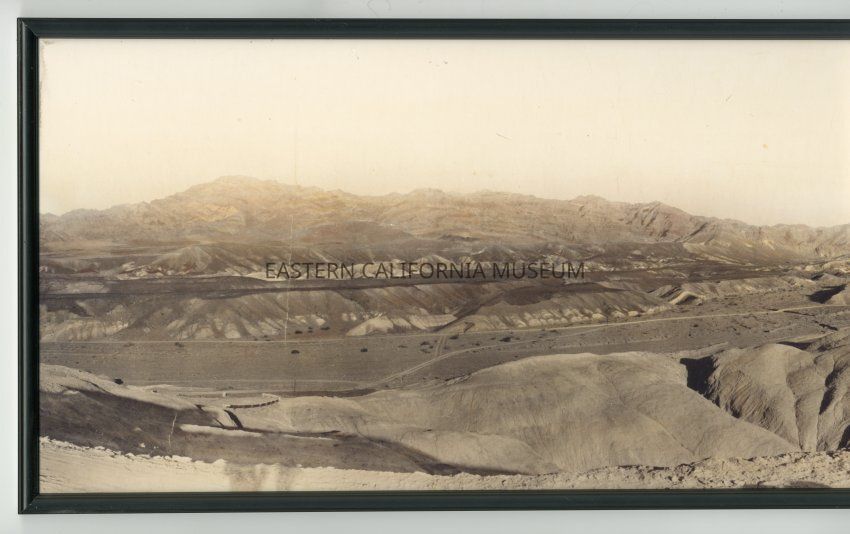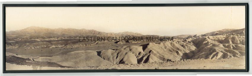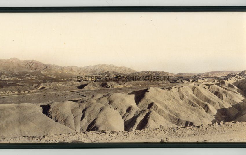This framed sepia-tone photograph is one half of a diptych of Zabriskie Point in Death Valley, 1931. It is the right side panel, and it shows the landscape with a dirt road in the lower left side of the photo.